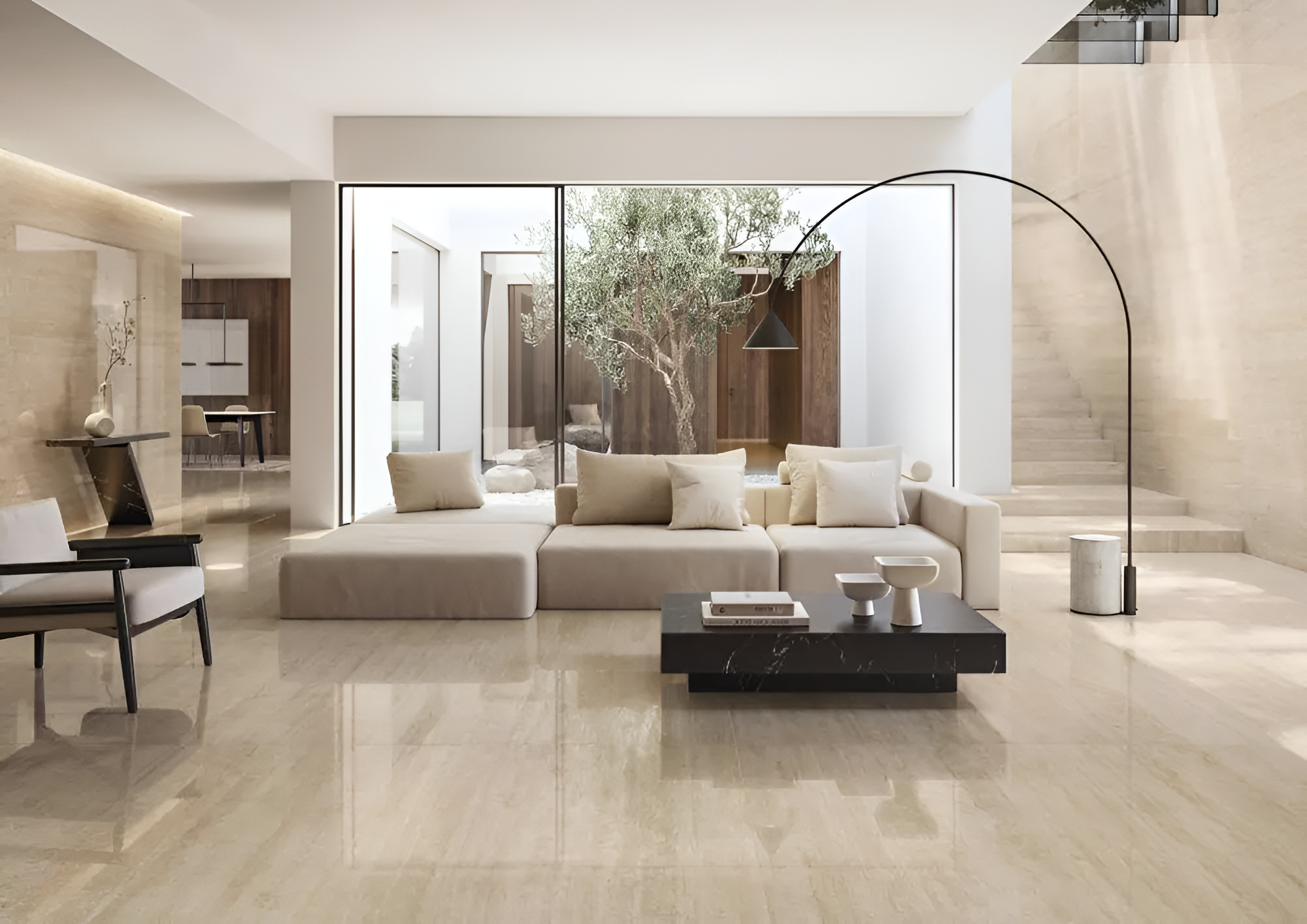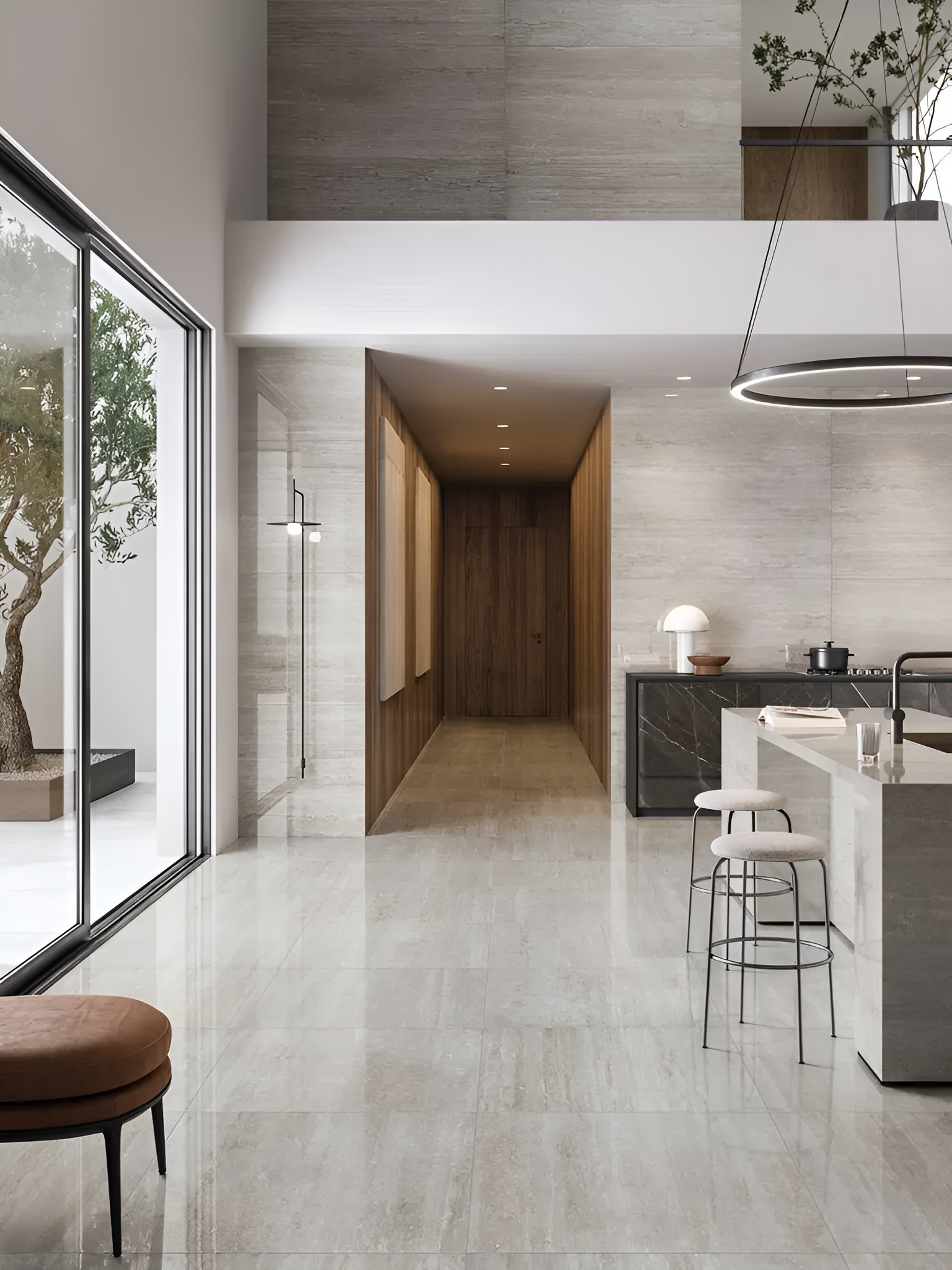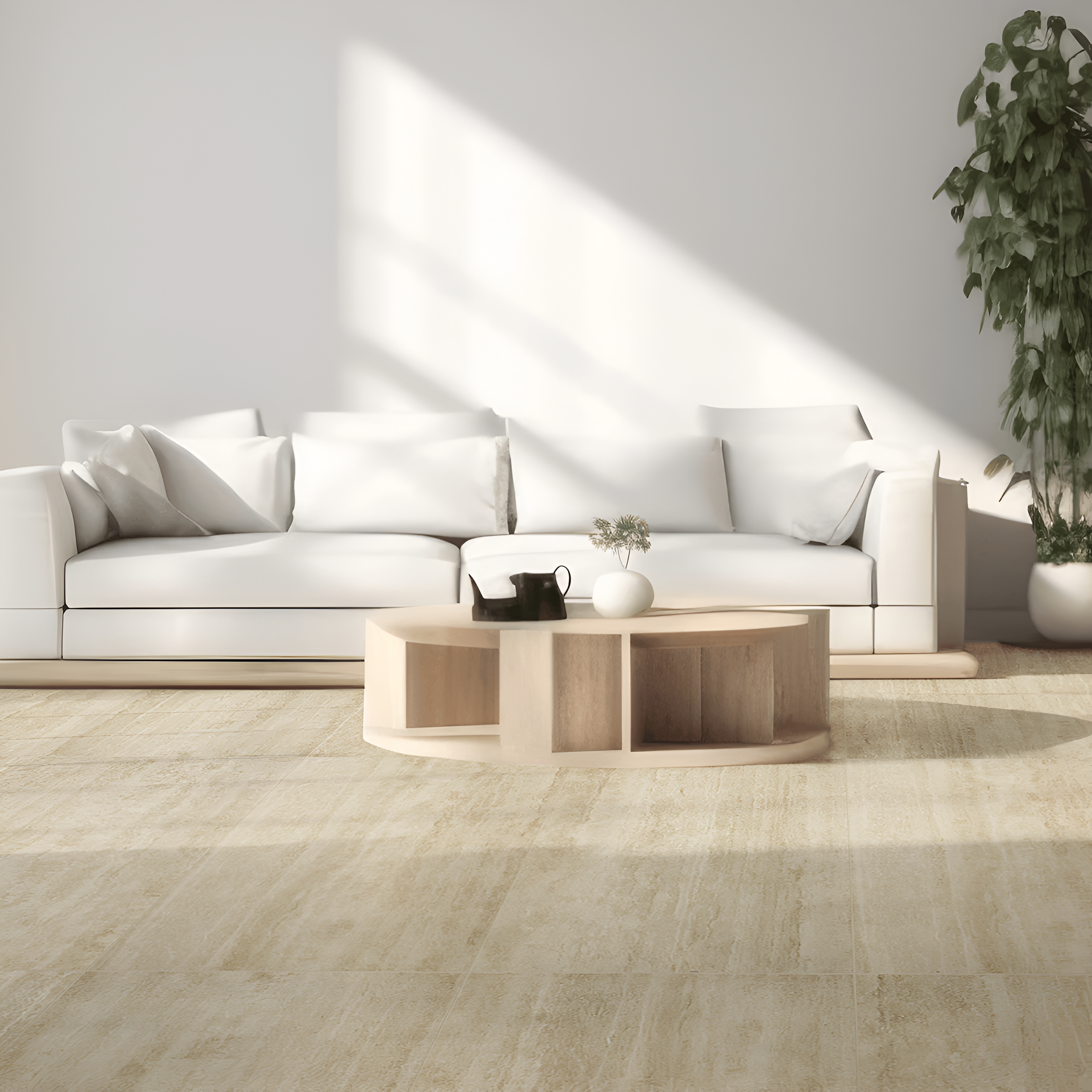 - High-quality porcelain inspired by stone and travertine for a refined and luxurious appearance.